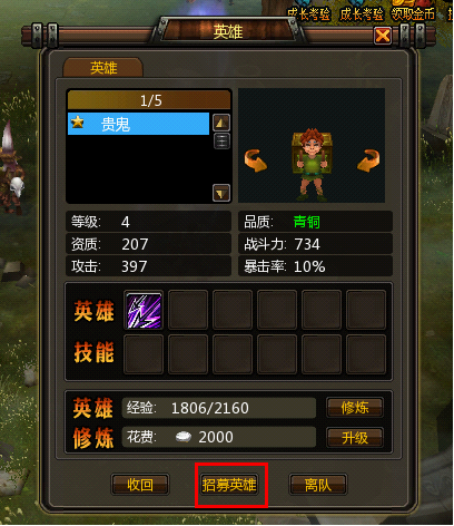 PS:“英雄”按钮需要玩家到达一定等级,完成任务开启
