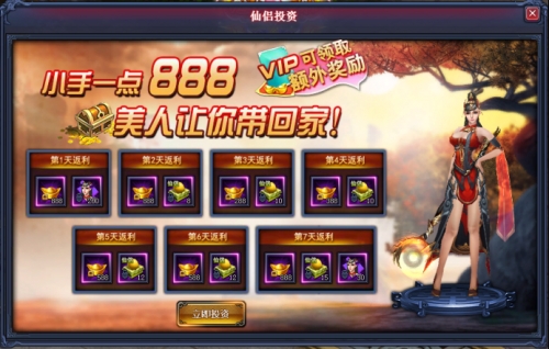 2.投资后可以连续7天获得珍稀仙侣碎片、绑定元宝、仙侣强化丹等超值奖励