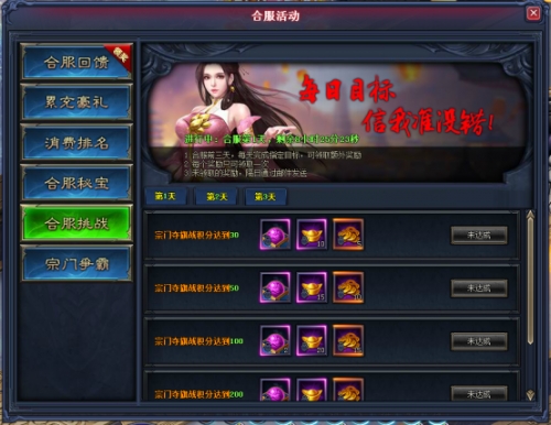 1.新增合服挑战玩法,活动时间内参与指定活动并达成,即可免费领取好礼一份