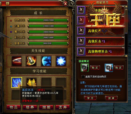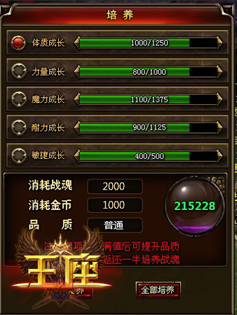 除了技能之外,37《王座》中每个英雄都有体质、力量、魔力、耐力和敏捷5种成长资质,分别对应英雄的气血、物理攻击、魔法攻击、抗性和速度属性,资质的高低会对英雄的属性造成很大影响。通过消耗战魂可以提升英雄的成长资质,当英雄的任意4项成长资质都培养满后,英雄的会自动进阶到下一品质。