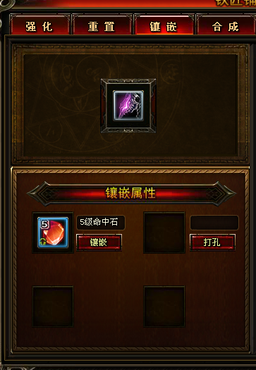 宝石镶嵌 拥有宝石孔位的装备可以镶嵌宝石,镶嵌后装备会获得宝石属性加成 通过打孔操作可以增加装备孔位(最多4个)。