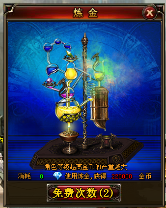 炼金 玩家可以花费一定的钻石,获得一定的黄金,是玩家快速获得黄金的一种方式,玩家每日可免费炼金2次。 成为VIP之后,根据VIP等级会额外获得一定数量的炼金次数。