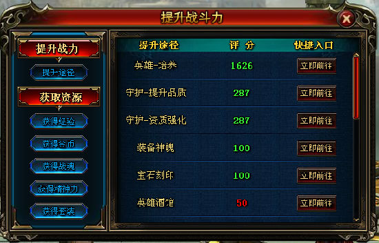 战斗力 战斗力是角色实力的综合体现,战斗力的高低直接决定了角色实力的强弱 通过战斗力界面可以清晰明了的了解角色当前实力,通过战斗力评分可以明确角色需要加强的地方