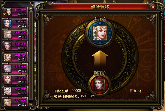 经验转移 随着角色等级提示,高级招募到的守护会逐步替代之前的守护。 通过经验转移可以快速提示新守护的等级,免去枯燥的练级过程