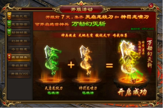 活动内容:活动期间,集齐天启龙纹刀和神罚龙啸刀可开启绝世神兵-万劫幻灭斩。