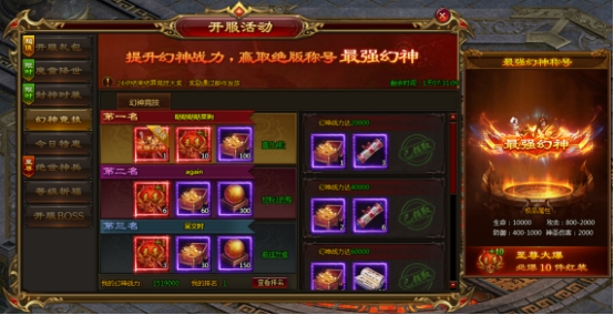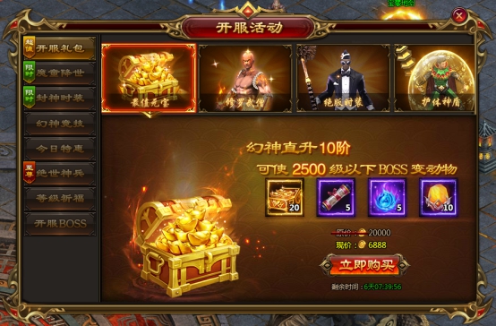 活动内容:活动期间,玩家可以花费少量雷霆币购买超值礼包,可以快速提升幻神、幻神皮肤、绝版时装、护体神盾。