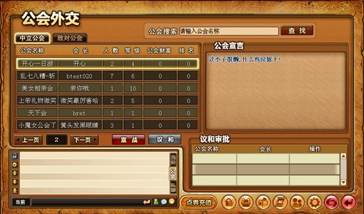 进入公会外交界面后,玩家可以查看其他公会与自己公会的外交状态, 其中会长可以对中立的公会进行宣战或者向敌对的公会议和。