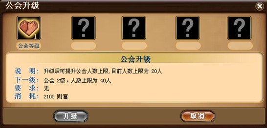会长可以对公会进行升级,升级需要消耗公会的财富,升级后的公会可以招纳更多的公会成员,以后还将会推出公会商城升级、个人银行升级等各项辅助设施,帮助玩家把自己的公会建立得更强大。