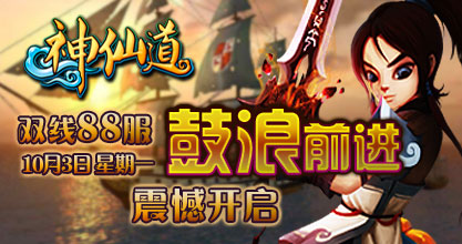 37wan平台2011最新仙侠大作,《神仙道》双线88服“鼓浪前进”将于10月3日10点火爆开启!《神仙道》是一款横版RPG类型的仙侠题材的网页游戏,在游戏中,玩家将自身融入一个仙侠的世界,一路斩妖除魔,经历众多冒险关卡,享受与各种妖魔鬼怪的战斗带来的打击刺激,游戏玩的就是惊险,游戏玩的就是剧情。让我们一起“修仙求道,猎命改运”。