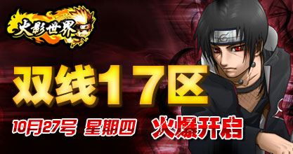 37wan超人气动漫横版网页游戏《火影世界》即将于10月27日12:00火爆开启双线17服。《火影世界》是一款横版动漫题材即时忍术动作类的Q版网页游戏,游戏融合了忍者文化精髓,集合了追踪、侦察、谍报、护送、暗杀等多方面的内容,忍术技能炫目华丽,精彩目不暇接。神秘忍界的极致画面,让你体验漫画中忍术打斗所带来的空前刺激,享受PK的快感!喜迎新服开启,系列精彩活动重磅出击,更多精彩内容助你轻松闯荡火影的世界!