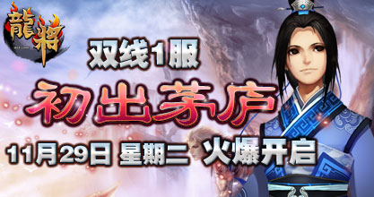 37《龙将》双线1服“初出茅庐”将于2011年11月29日13:00震撼开启。精彩即将上演,超乎想象的游戏体验正期待您的加入! 喜迎新服开启,37《龙将》已为您准备了丰富的开服活动助你在三国乱世中驰骋沙场、建功立业!