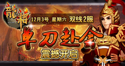 37《龙将》双线2服“单刀赴会”将于2011年12月3日13:00震撼开启。精彩即将上演,超乎想象的游戏体验正期待您的加入! 喜迎新服开启,37《龙将》已为您准备了丰富的开服活动助你在三国乱世中驰骋沙场、建功立业!