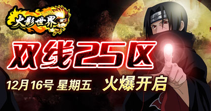 37wan超人气动漫横版网页游戏《火影世界》即将于12月16日12:00火爆开启双线25服。《火影世界》是一款横版动漫题材即时忍术动作类的Q版网页游戏,游戏融合了忍者文化精髓,集合了追踪、侦察、谍报、护送、暗杀等多方面的内容,忍术技能炫目华丽,精彩目不暇接。神秘忍界的极致画面,让你体验漫画中忍术打斗所带来的空前刺激,享受PK的快感!喜迎新服开启,系列精彩活动重磅出击,更多精彩内容助你轻松闯荡火影的世界!