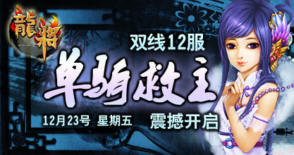 37《龙将》双线12服“单骑救主”将于2011年12月23日13:00震撼开启。精彩即将上演,超乎想象的游戏体验正期待您的加入! 喜迎新服开启,37《龙将》已为您准备了丰富的开服活动助你在三国乱世中驰骋沙场、建功立业!