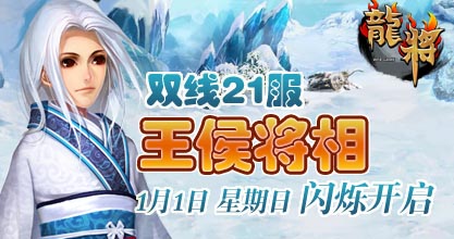 37《龙将》双线21服“王侯将相”将于2012年1月1日14:00震撼开启。精彩即将上演,超乎想象的游戏体验正期待您的加入! 喜迎新服开启,37《龙将》已为您准备了丰富的开服活动助你在三国乱世中驰骋沙场、建功立业!