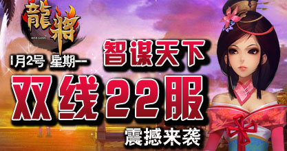 37《龙将》双线22服“知谋天下”将于2012年1月2日14:00震撼开启。精彩即将上演,超乎想象的游戏体验正期待您的加入! 喜迎新服开启,37《龙将》已为您准备了丰富的开服活动助你在三国乱世中驰骋沙场、建功立业!