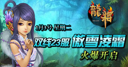 37《龙将》双线23服“傲雪凌霜”将于2012年1月3日14:00震撼开启。精彩即将上演,超乎想象的游戏体验正期待您的加入! 喜迎新服开启,37《龙将》已为您准备了丰富的开服活动助你在三国乱世中驰骋沙场、建功立业!