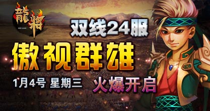 37《龙将》双线24服“傲视群雄”将于2012年1月4日14:00震撼开启。精彩即将上演,超乎想象的游戏体验正期待您的加入! 喜迎新服开启,37《龙将》已为您准备了丰富的开服活动助你在三国乱世中驰骋沙场、建功立业!