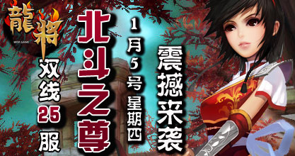 37《龙将》双线25服“北斗之尊”将于2012年1月5日14:00震撼开启。精彩即将上演,超乎想象的游戏体验正期待您的加入! 喜迎新服开启,37《龙将》已为您准备了丰富的开服活动助你在三国乱世中驰骋沙场、建功立业!