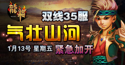 37《龙将》双线35服“气壮山河”将于2012年1月13日15:00震撼开启。精彩即将上演,超乎想象的游戏体验正期待您的加入! 喜迎新服开启,37《龙将》已为您准备了丰富的开服活动助你在三国乱世中驰骋沙场、建功立业!