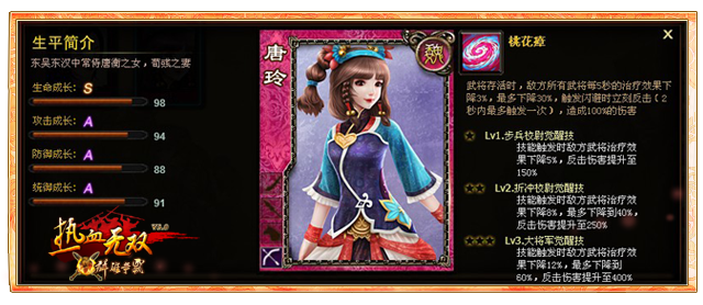 缺点:武将以降低对方治疗效果为主,需在初期对其进行保护,在闪避较低时,需谨慎考虑反击操作。