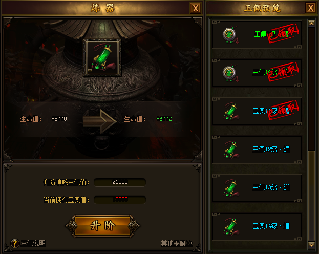 低等级玉佩可以通过消耗玉佩值进行升级,成为更高一级的玉佩,带来更多的生命值加成。拥有高等级玉佩之后,一向脆皮的法师也能站撸BOSS啦!