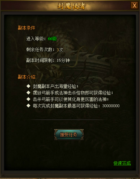 快速获得经验值的一个活动,玩家进入活动场景后通过摆放弓箭手来击杀副本中的怪物来获得经验值;每次完成后最高可获得300万经验 该活动每日可完成三次,每日活动时间为15分钟;