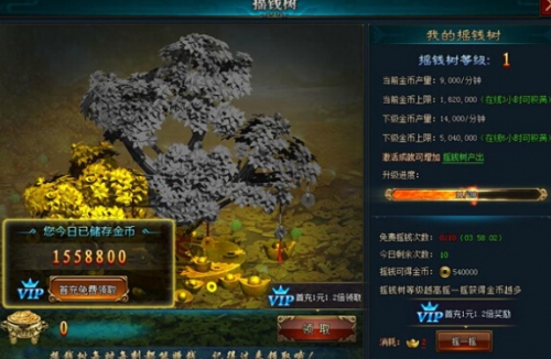 除了每分钟都获得金币外,还能通过摇一摇摇钱树直接获得大量金币,摇一摇前5次完全免费。每摇一摇都会获得一个天妖秘宝,天妖秘宝可以提升摇钱树的等级。摇钱树最高5级,5级的摇钱树每分钟就能生产28000的金币。摇钱树等级提升后会获得更多的金币。