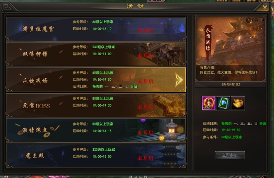 1. 每周一、三、五、日开启,19:30~19:50开放活动入口,玩家达到60级以上(包括60级)可以进入。