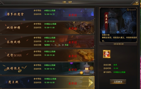 1. 每天开放,玩家等级达到320级以上,时间15:00~16:00点,可以进入活动场景。