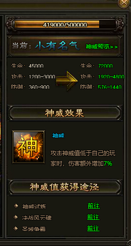 神威升级需要神威值,玩家获得神威值后,神威可以自动升级。神威值有很多获取方式: