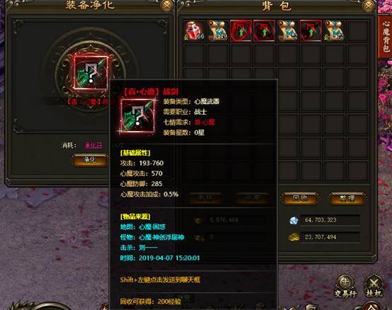 同时,在心魔地图里获取的装备,由于受到心魔瘴气的影响,只有一点点可怜的属性,此时需要玩家们将装备带给心魔村的长老进行净化后,才会展现它原有的实力。心魔装备净化后,还会随机出现装备星级,从1~~10星。是欧还是酋,可以找心魔村长老净化一下装备测试测试。