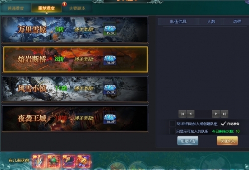 多人副本介绍:多人副本主要是获取伙伴装备和婚姻装备的地方。难度比较高建议组队玩成,人越多打的越快,是快速提升伙伴装备最快的途径之一。