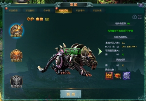 五、 军团活动 军团活动分为:挑战神兽和军团BOSS。 挑战神兽每周一0点重置,神兽数量和守护兽的等阶挂钩,玩家挑战成功后将获得神兽宝箱和军团贡献奖励。 玩家在挑战不过去的时候,可以联系军团高战玩家先进行挑战,这样可以让BOSS难度下降,已通关人数越多,BOSS难度越低。