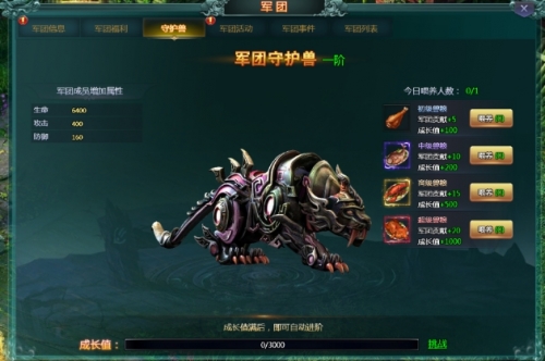 四、 守护兽 玩家在击败BOSS时有几率获取兽粮,兽粮可以用于喂养军团守护兽,喂养后玩家可获得军团贡献,守护兽可获得成长值,成长值用于进阶守护兽。 守护兽等级提升后,军团所有成员可以获得属性加成,同时还能解锁挑战神兽;守护兽等级越高,军团所有成员属性加成更高。