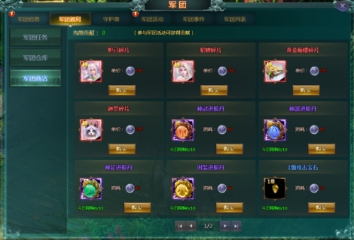 军团商店出售部分进阶道具、伙伴碎片、宝石,玩家可以使用军团贡献进行购买。
