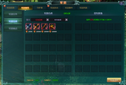 军团仓库是军团成员互换装备的重要途径,玩家可在这通过把自己暂时用不上的装备放入仓库获取积分,然后兑换仓库里自己能用的装备(积分不会随着退出军团而消失)。