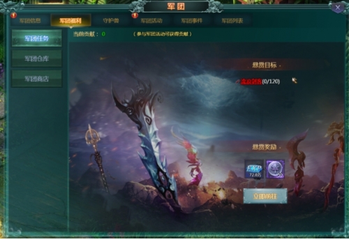 三、军团福利 军团福利包括军团任务、军团仓库、军团商店。 军团任务每天可完成20环,完成将获得大量经验和军团贡献。