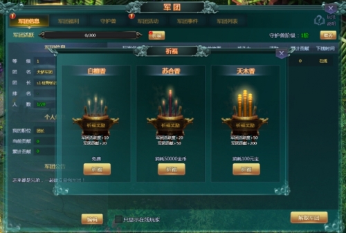 二、 祈福祈福是提升军团活跃的唯一途径,玩家加入军团后每天可以祈福一次,祈福后军团获得活跃度,玩家自身可获得军团贡献。需要注意的是,如果军团活跃度持续14天没有增加且军团等级小于3级会被系统自动解散