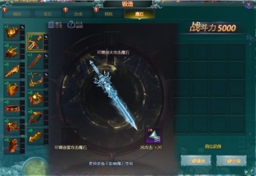 魔石:该玩法主要提升人物的属性攻击,通过镶嵌属性宝石提升人物的攻击伤害,每个部分最多可镶嵌3颗属性宝石。属性宝石包括,风、雷、火三种。