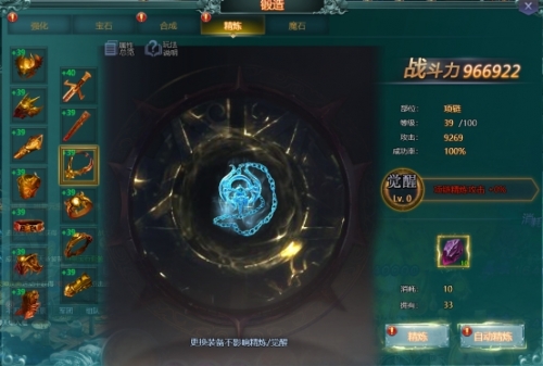 精炼:该玩法主要用于精炼人物的装备提升装备属性。当精炼到一定等级可激活觉醒,从而额外在提升装备的属性。