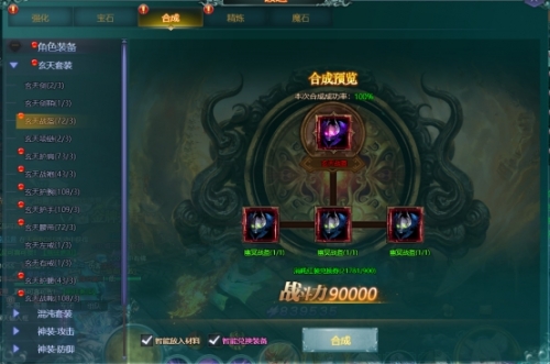 合成:该玩法主要合成人物的装备,相同部位的装备有3件加上一定数量的兑换卷即可进行合成。最高可合成圣.人皇套装。装备等阶越高属性越高,有可合成的装备赶紧来合成吧!