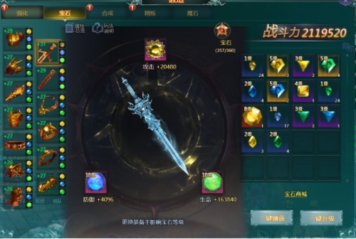 宝石:对应都部分穿戴了装备即可进行宝石的镶嵌,每个装备部位可镶嵌3个宝石。分别可镶嵌,攻击、防御、生命宝石,更换装备不影响宝石等级。