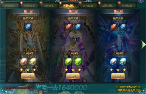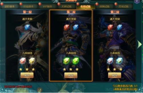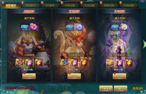 资源副本玩法主要包括;进阶副本、经验副本、VIP副本,天神试炼、名将试炼、战骑试炼、灵宠试炼。是提升人物经验和伙伴技能必要参加的玩法之一。