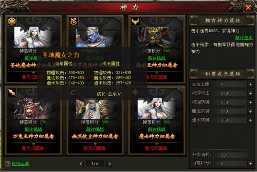 3)BOSS神力可成长,当全服玩家击杀一定数量该BOSS,神力属性增加