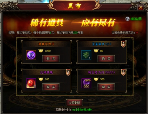 黑市可通过刷新购买到非常稀有的道具