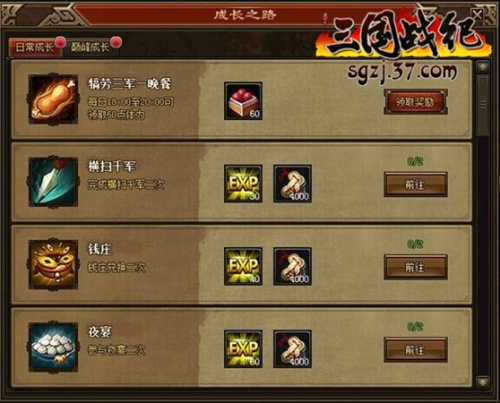 玩家每天可以在37《三国战纪》中完成一些常规的游戏操作(例如购买商店物品、技能升级、装备附魔、祈福等),游戏活动(例如参与多人副本、财源广进、每日活动等)会完成对应的日常任务目标,日常任务奖励大量主公经验和铜币。每天的日常成长任务会在第二天0点重置,所以当天的任务要尽快完成!