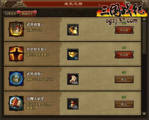 玩家在完成指定主线任务后,会开启成长之路功能,成长之路包含了游戏日常任务和成就任务,完成这2类任务可以帮助你熟悉游戏的所有功能,并获得大量主公经验和铜币奖励。