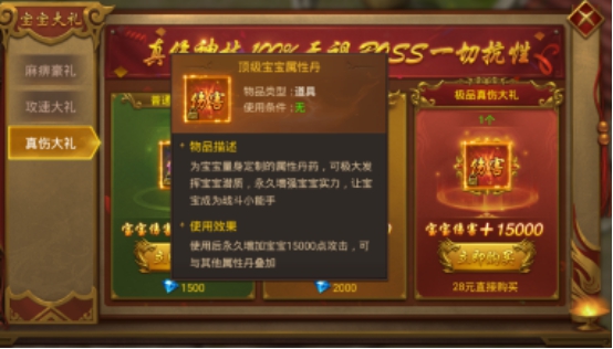 ②稀有真伤大礼,花费2000钻直接购买,可获得高级宝宝属性丹,使用后永久增加宝宝10000点攻击,可与其他属性丹叠加。