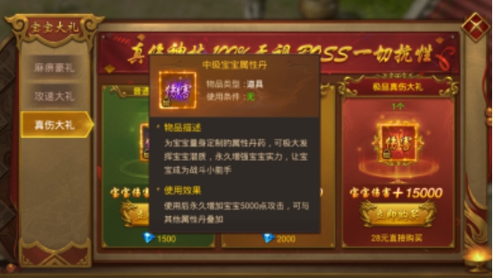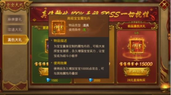 ①普通真伤大礼,花费1500钻直接购买,可获得中级宝宝属性丹,使用后永久增加宝宝5000点攻击,可与其他属性丹叠加。